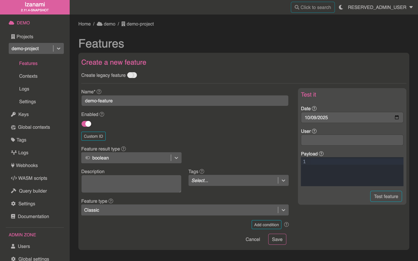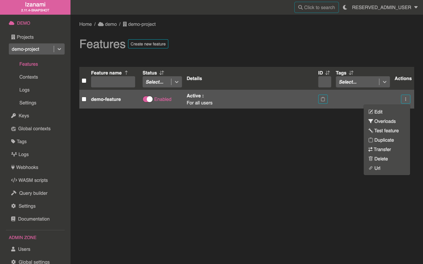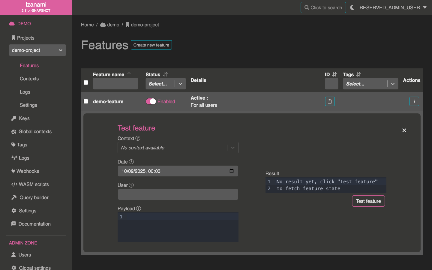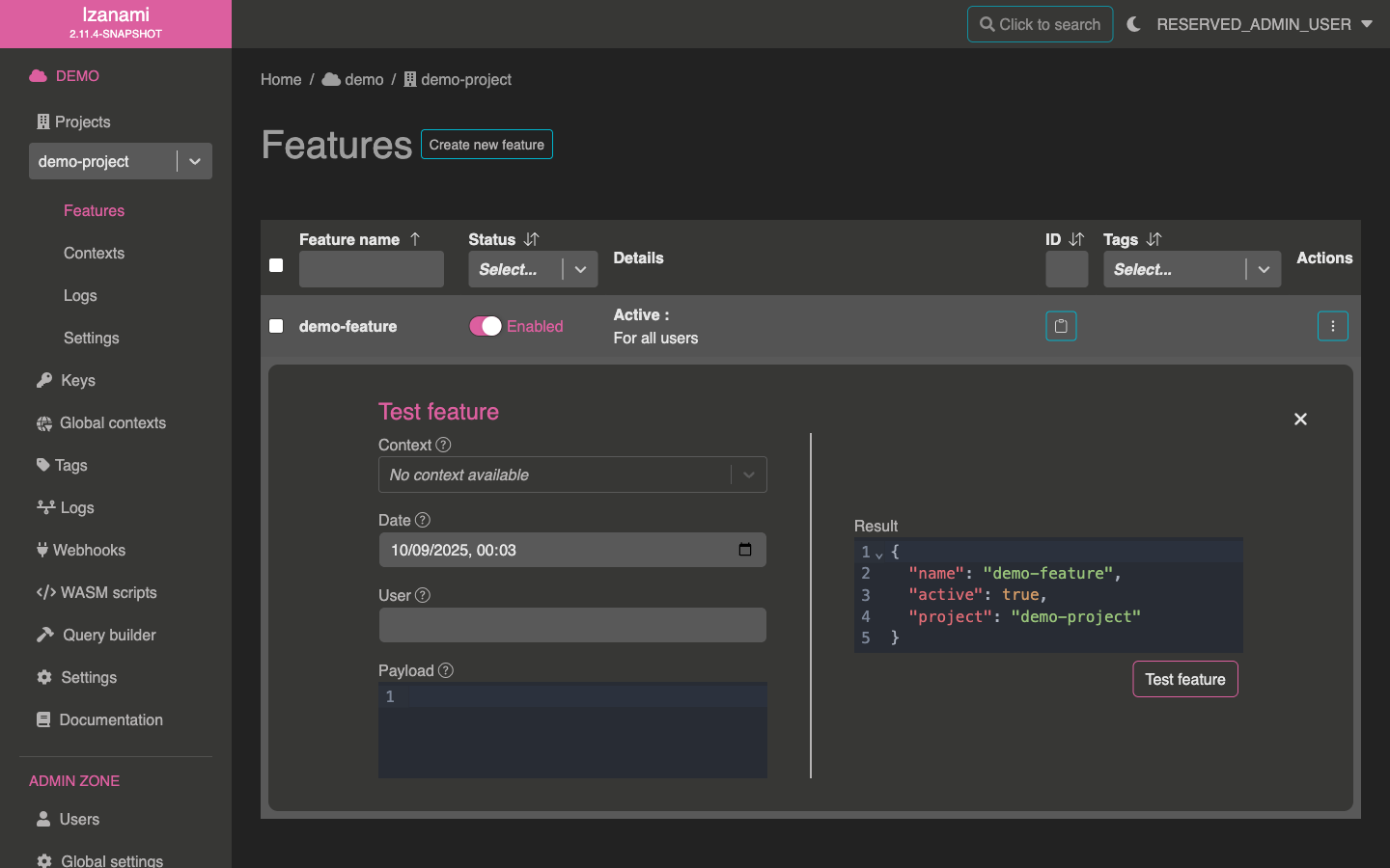 Izanami allows to test feature from backoffice. Click on action icon at the end of your feature row.