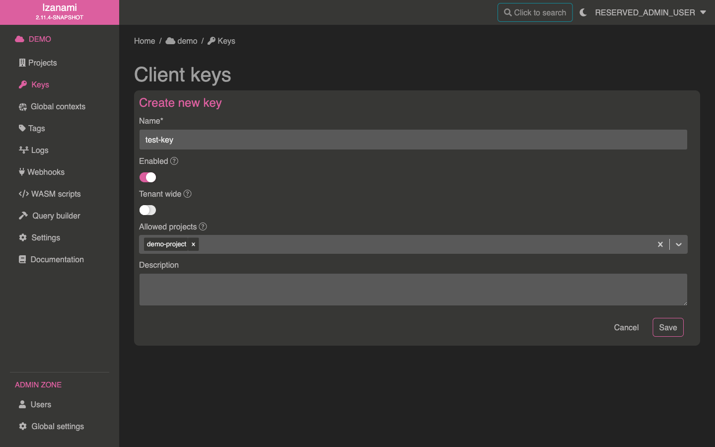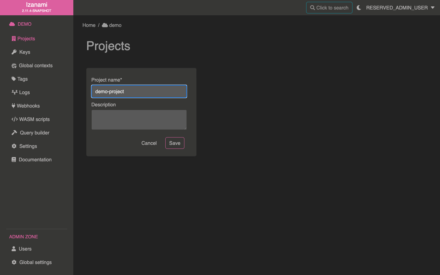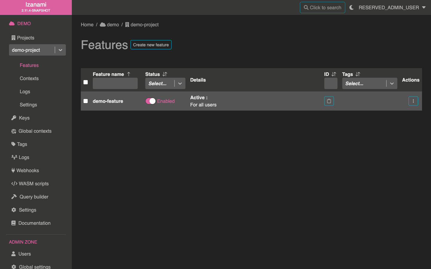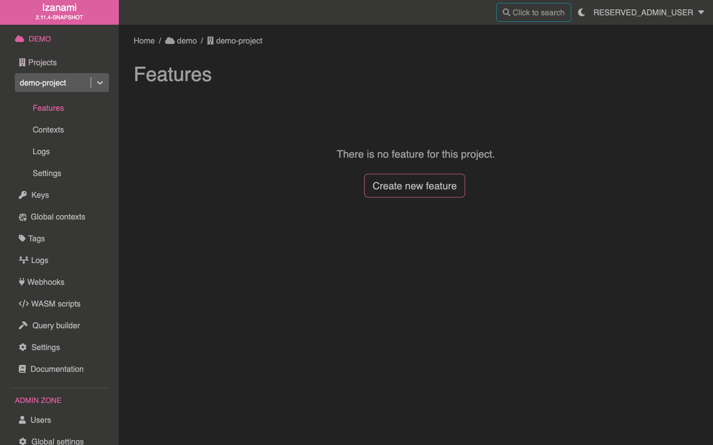 After validating this form, Izanami once again redirects you, this time on the new project page.