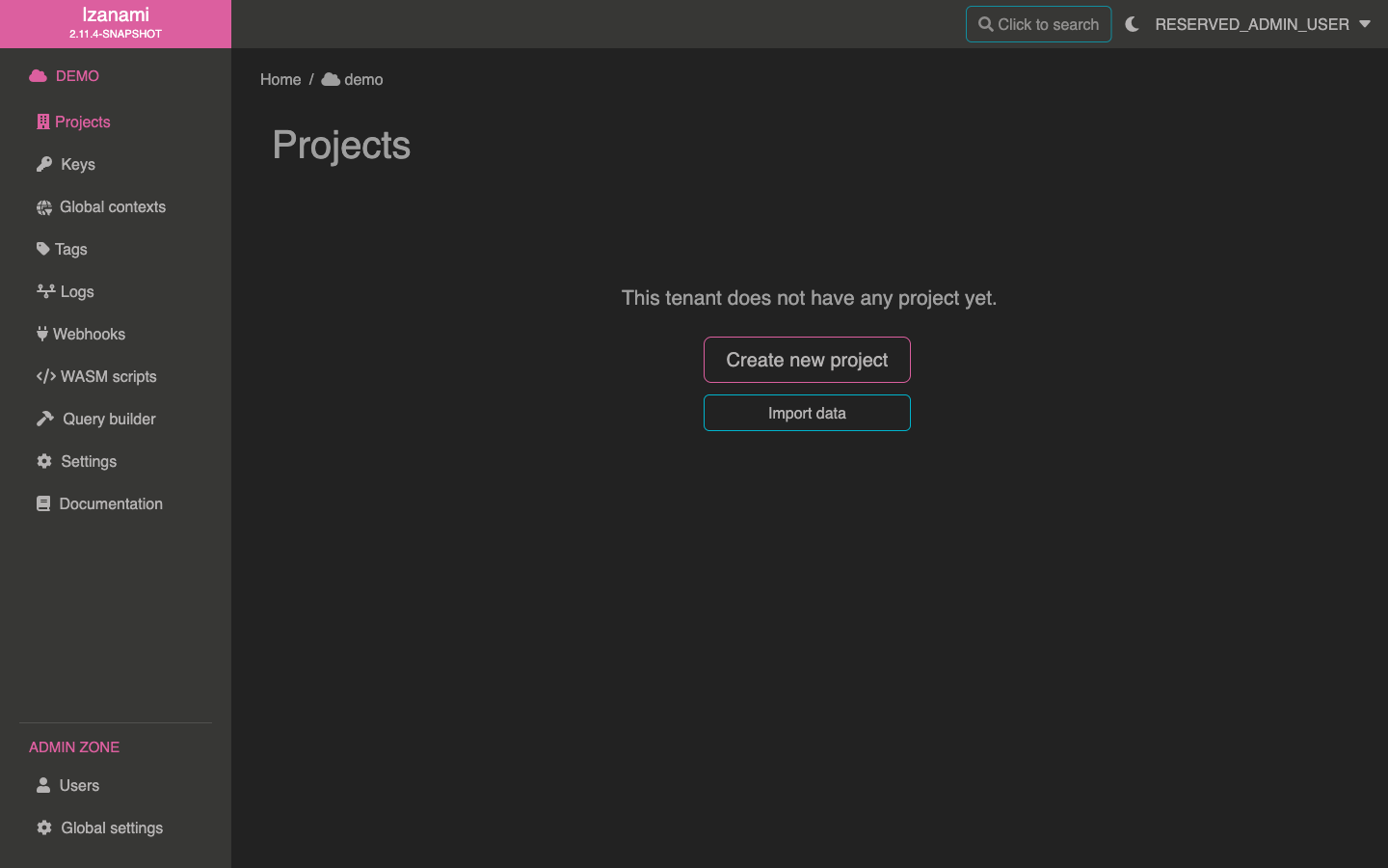 Once tenant is created, Izanami redirects you its page, and indicates that there is no project for this tenant yet.