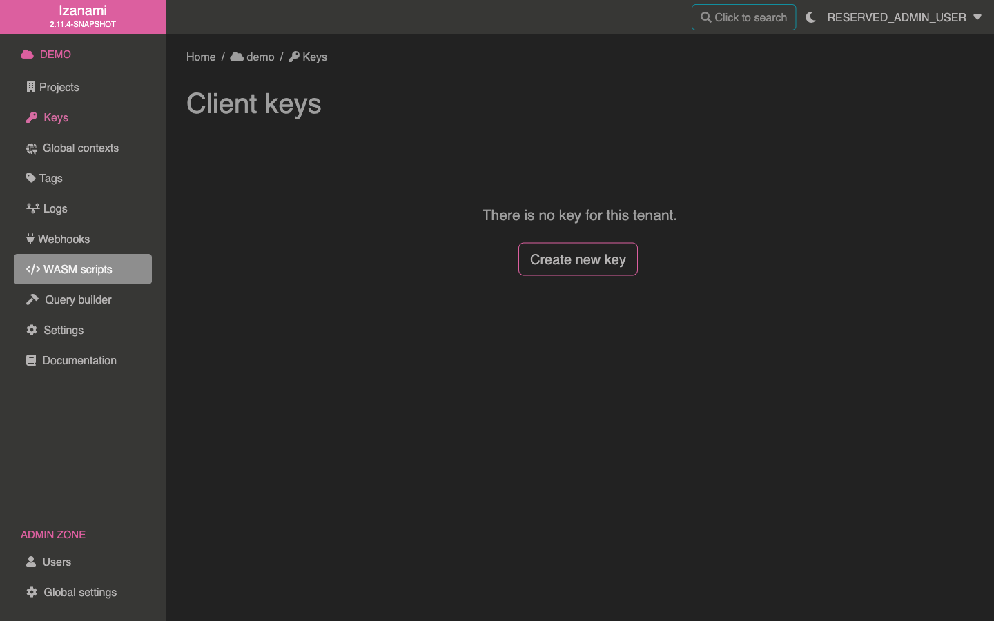 First let's go to the API key screen, click on "Keys" entry of left menu.
