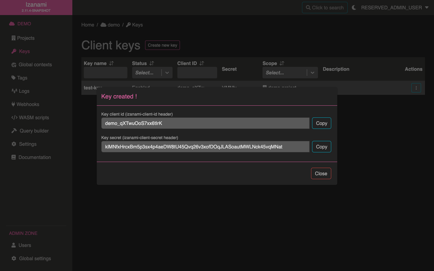 Once your key is created, a popup will display associated client id and secret.