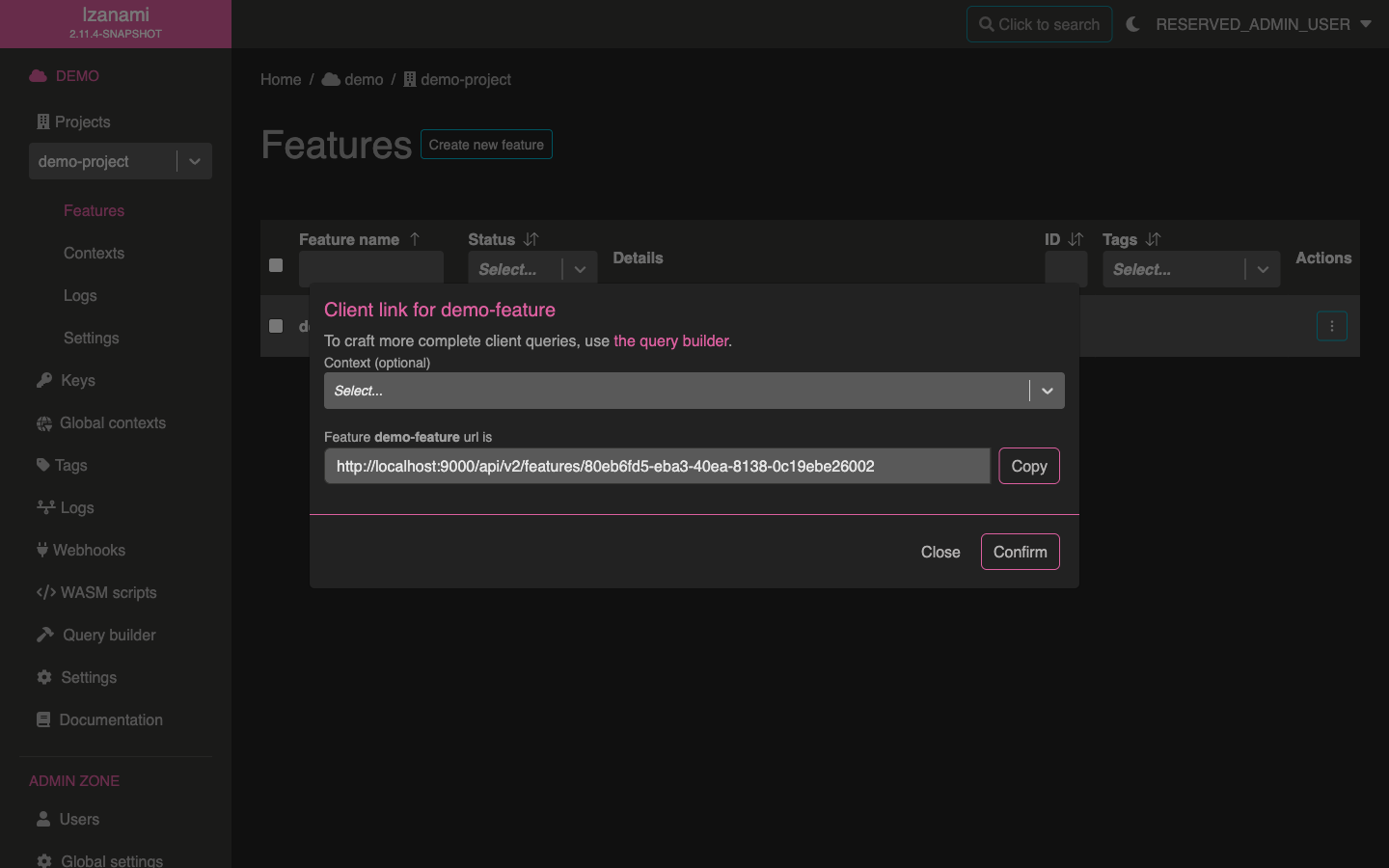 Click the "copy" button to copy feature URL.