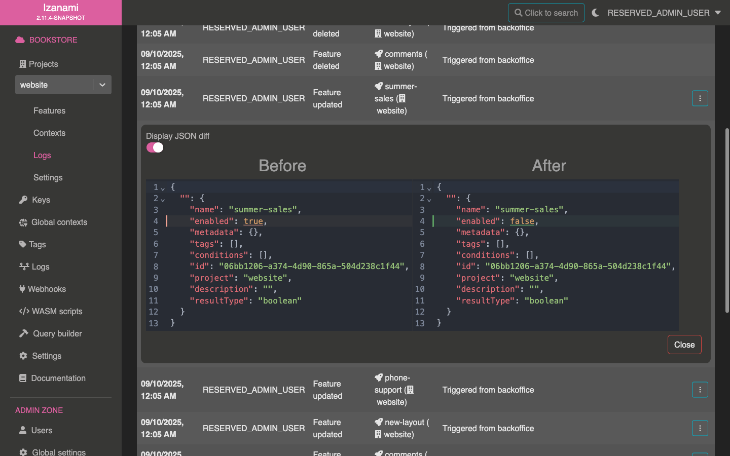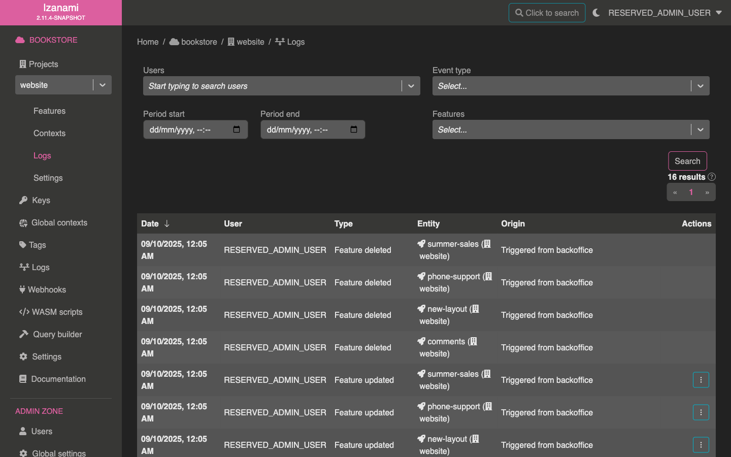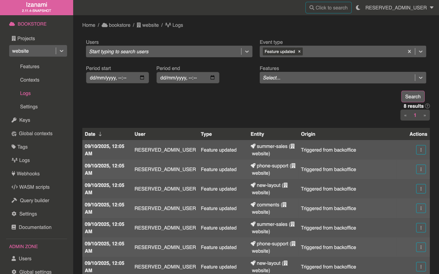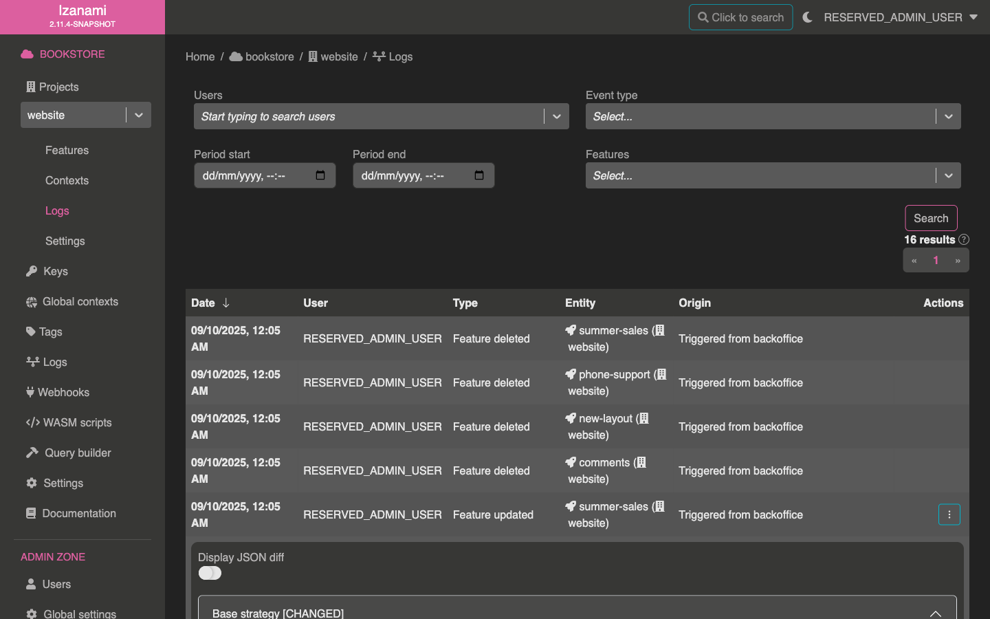 To help diagnose such cases, Izanami offers an audit log on projects. Each user action that modifies a feature activation strategy (update, deletion, reimport,...) creates an entry in this log.