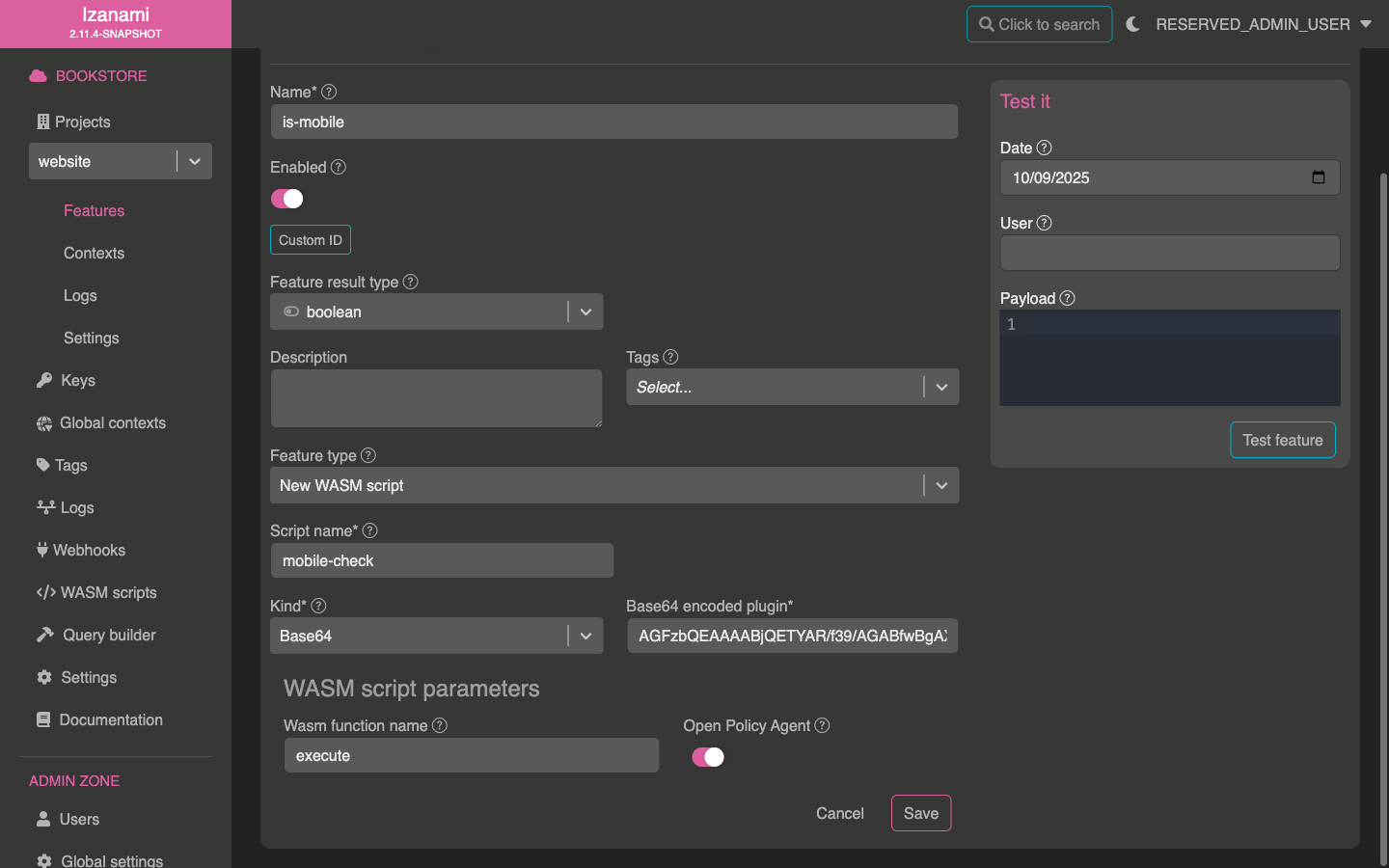 Once you've got your Base64 script, you'll need to create a WASM Base64 feature in Izanami.