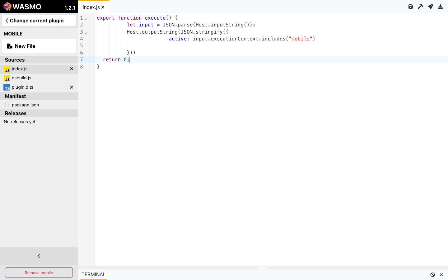 We'll one again create a script that returns true if mobile is one of request contexts, and false otherwise. Let's paste following code in WASMO editor :