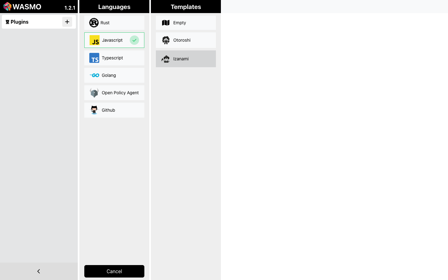 First, let's create our plugin in WASMO, for this example, we will create an Izanami js plugin.