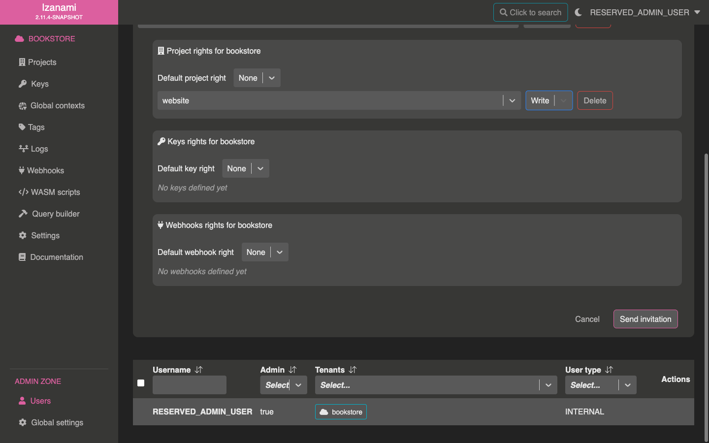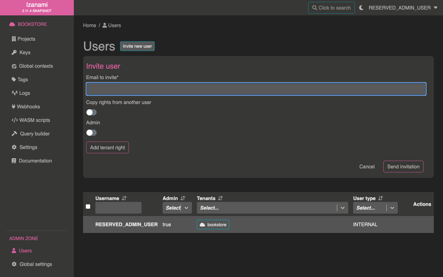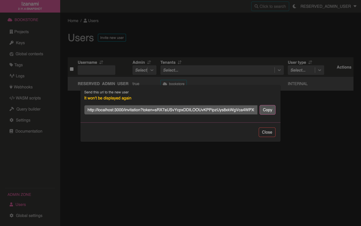 Once the invitation is sent, Izanami will either display the invitation link or send it to the specified email, based on your configuration.