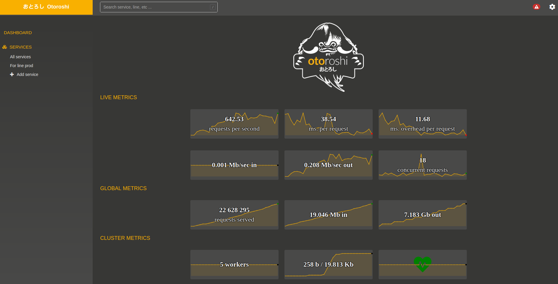 Once an Otoroshi instance is launcher as cluster Leader, a new row of live metrics tile will be available on the home page of Otoroshi admin UI.