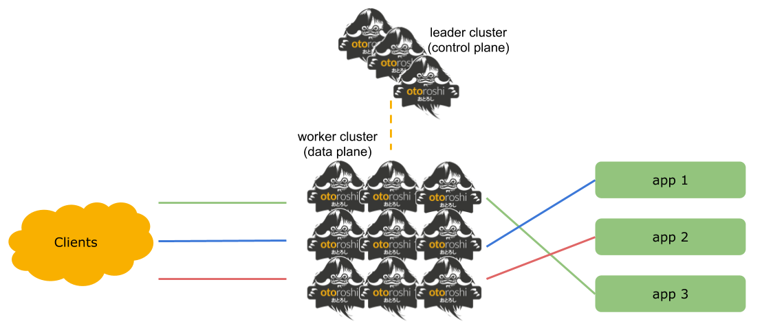 But sometimes, this is not enough. So Otoroshi provides an additional clustering model named Leader / Workers where there is a leader cluster (control plane), composed of Otoroshi instances backed by a datastore like Redis, PostgreSQL or Cassandra, that is in charge of all writes to the datastore through Otoroshi admin UI and API, and a worker cluster (data plane) composed of horizontally scalable Otoroshi instances, backed by a super fast in memory datastore, with the sole purpose of routing traffic to your services based on data synced from the leader cluster. With this distributed Otoroshi version, you can reach your goals of high availability, scalability and security.