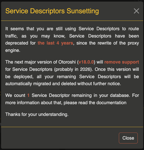 Now (v17.0.0) it's time to go ahead and provide some migration tools to help users getting rid of Service Descriptor in favor of routes before completely removing support of Service Descriptors in v18.0.0 (probably in 2026). Under the hood the new proxy engine already convert your Service Descriptors to Route in order to route traffic to your backends. The idea here is to remove the Service Descriptor entity in favor of the Route entity and let the user adapt their workflows and automations.