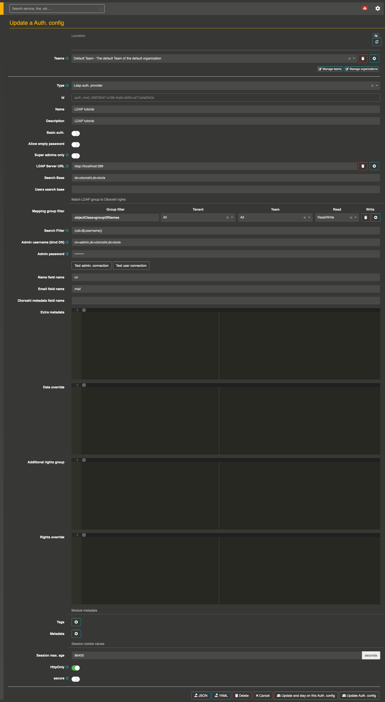 The next field Data override is merged with extra metadata when a user connects to a private app or to the UI (inside Otoroshi, private app is a service secure by any authentication module). The Email field name is configured to match with the mail field from LDAP user data.